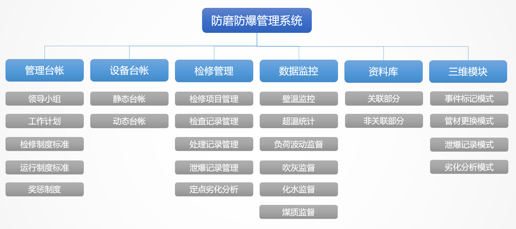 我國火力發電廠各種事故中,鍋爐事故約占發電廠總事故的70%以上,而過熱器、再熱器、省煤器、水冷壁四類管(簡稱“四管”)泄漏與爆破事故時有發生,在眾多事故中出現較多,約占鍋爐總事故的70%以上,成為困擾火力發電廠安全生產的一大難題。針對這一問題,云酷科技設計了防磨防爆可視化管理系統。